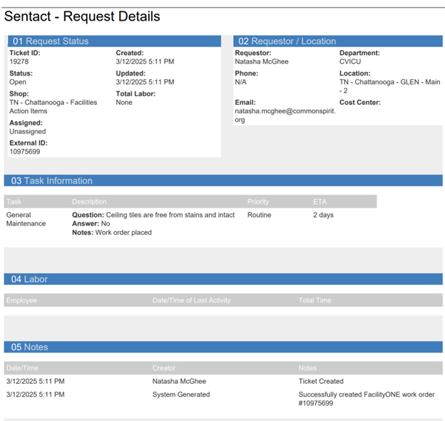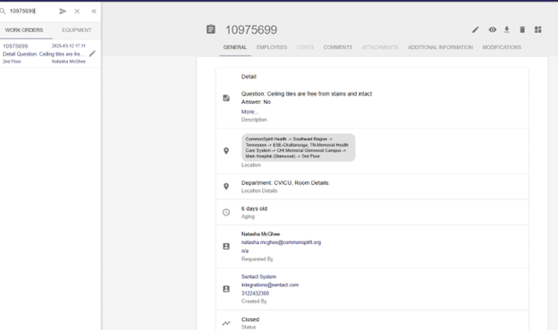 This integration allows your team to automatically generate work orders in UNITY when deficiencies are identified during EOC rounds in SentactRounding. For example, if a ceiling tile stain is noted, as shown in the screenshots below, a corresponding work order is created instantly—no need for duplicate entry or manual follow-up.
