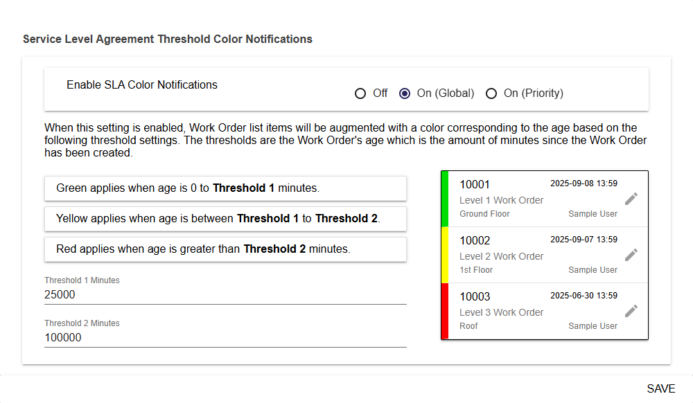 - Thresholds can be applied on a "Global" setting, meaning the same thresholds apply to all work orders regardless of Priority